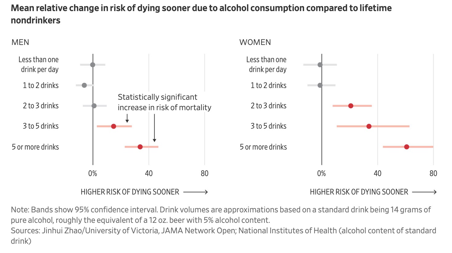 The findings suggest that the average man can drink up to about three drinks a day and expect to live as long as nondrinkers. Women might want to stop at about two drinks, the research suggested.”