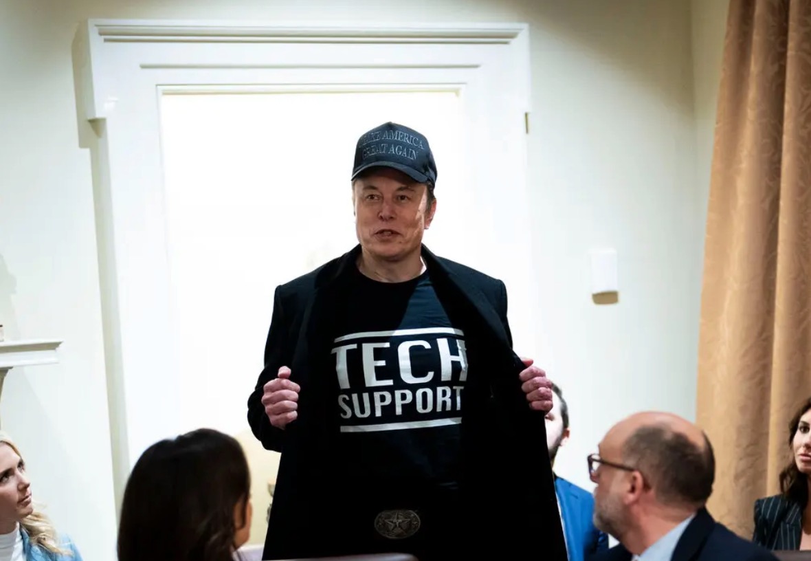 The talented team stared back at him. He was costumed very differently from them. He wore a black MAGA hat and the same “Tech Support” T-shirt he had on last week when he sat for a joint interview with the president on Fox News. “I actually just call myself a humble tech support,” the world’s richest man said, chuckling at this little bit of modesty. A few cabinet secretaries laughed along politely.